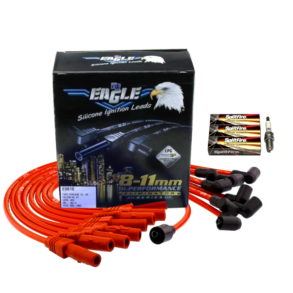 Eagle 9mm Ignition Spark Plug Leads Fit 8cyl Ford Fairlane ZA, ZB, ZC/ Falcon XR, XT Carb OHV 1966-70 and 90° Distributor & 180°Spark Plug Boots 289-302 Windsor STD Over Rocker Covers - RED w/ Splitfire Spark Plug