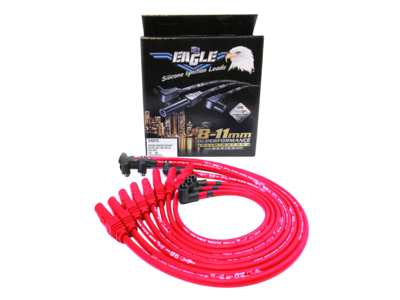 EAGLE 9mm Ignition Spark Plug Leads Holden V8 90°Dist 180°SPB (Red Mtr) 253-308 STD Around R/C Red
