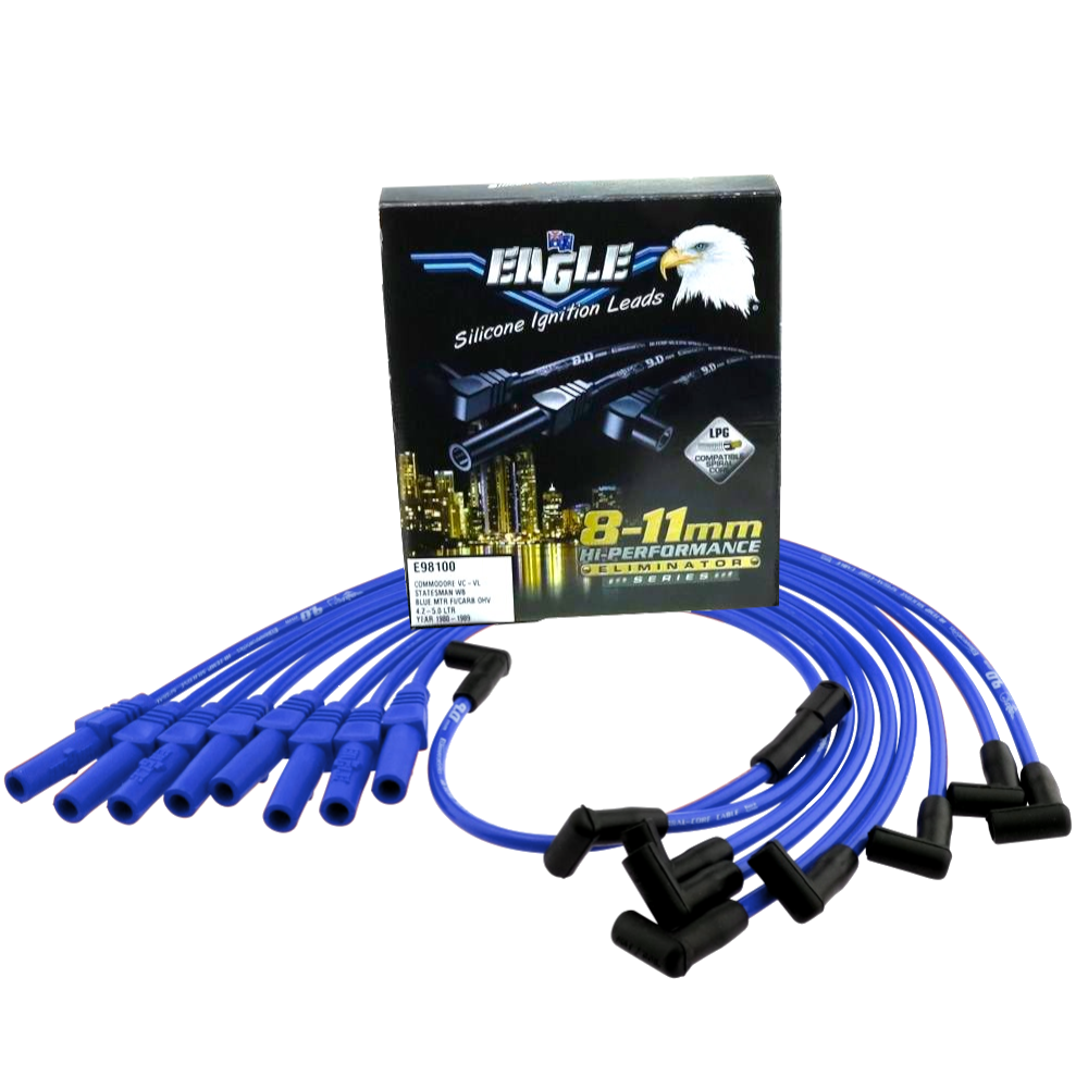 Eagle 9mm Ignition Spark Plug Leads Fit 8cyl Holden Commodore VC, VH, VK, VL (Inc Carb Mtrs), Holden WB, Statesman/Caprice WB Inc Ser II 1980-89 and 90° Distributor & 180°Spark Plug Boots - BLUE