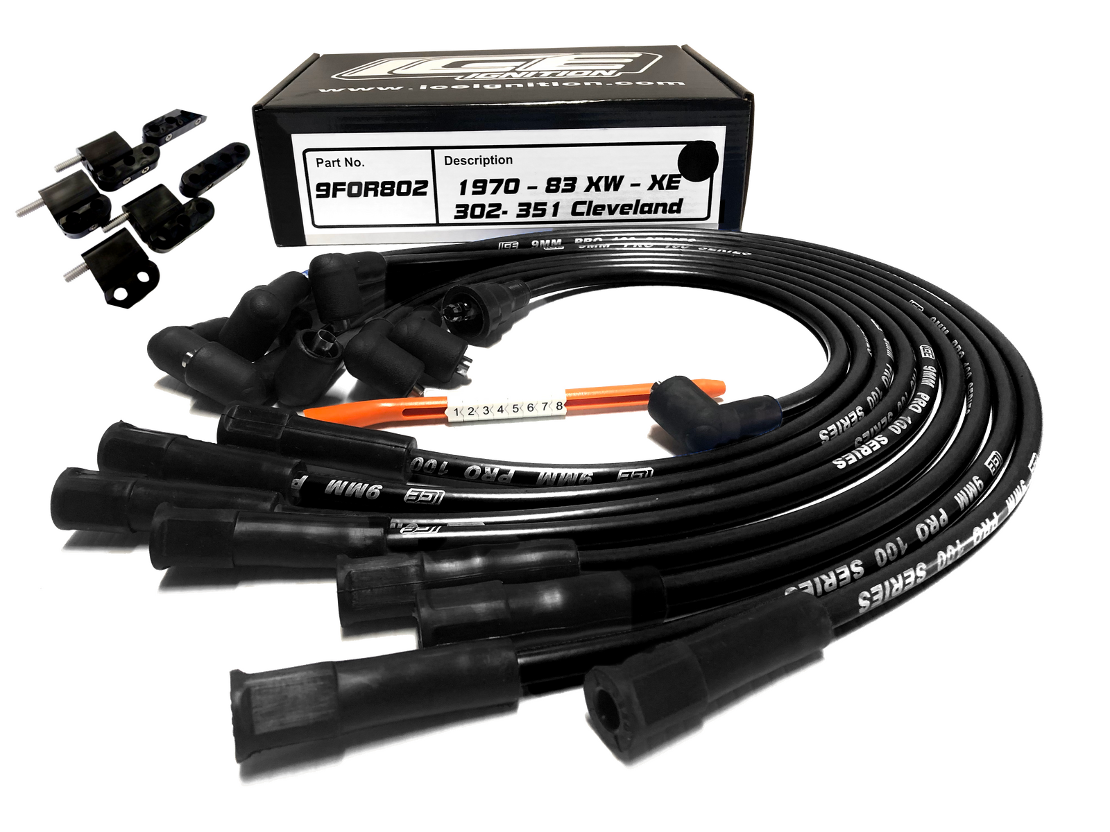 ICE PRO 100 9mm Spark Plug Leads V8 351 Cleveland STD Female Cap Over Rocker Covers + Mounts
